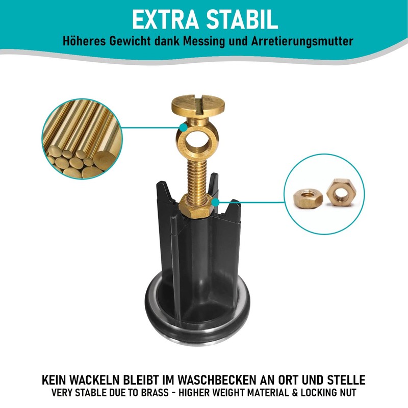 - The extra heavy brass screw ensures a stable hold and prevents the plug from wobbling in the drain.