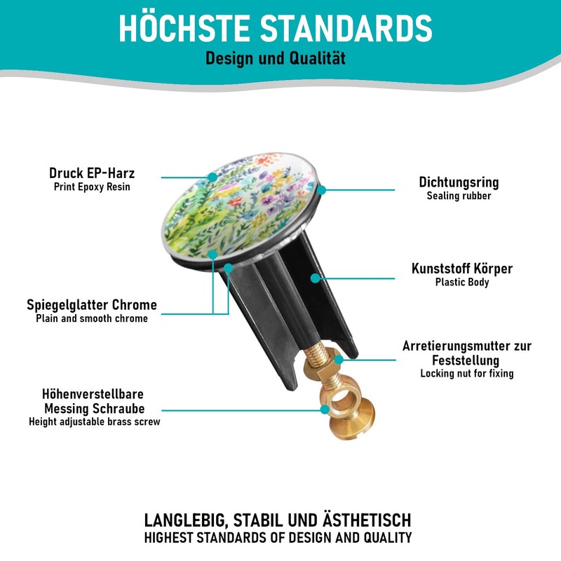 Arteneur Sink Plug 40 mm Colourful Flowers - Stainless Steel Excenter Plug with Extra Heavy Brass Screw for Stable Hold | Universal Drain Plug for Sink