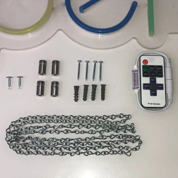 Sign comes with power adapter, remote controller with on/ off switch & dimmer, hanging kits