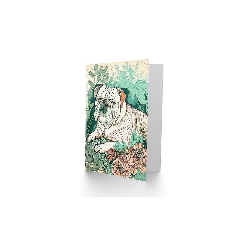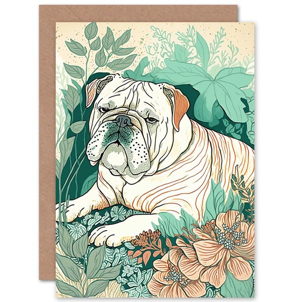Artery8 Bulldog Lying in a Flower Field Modern Pastel Colour Linocut Illustration Art Birthday Sealed Greeting Card Plus Envelope Blank inside