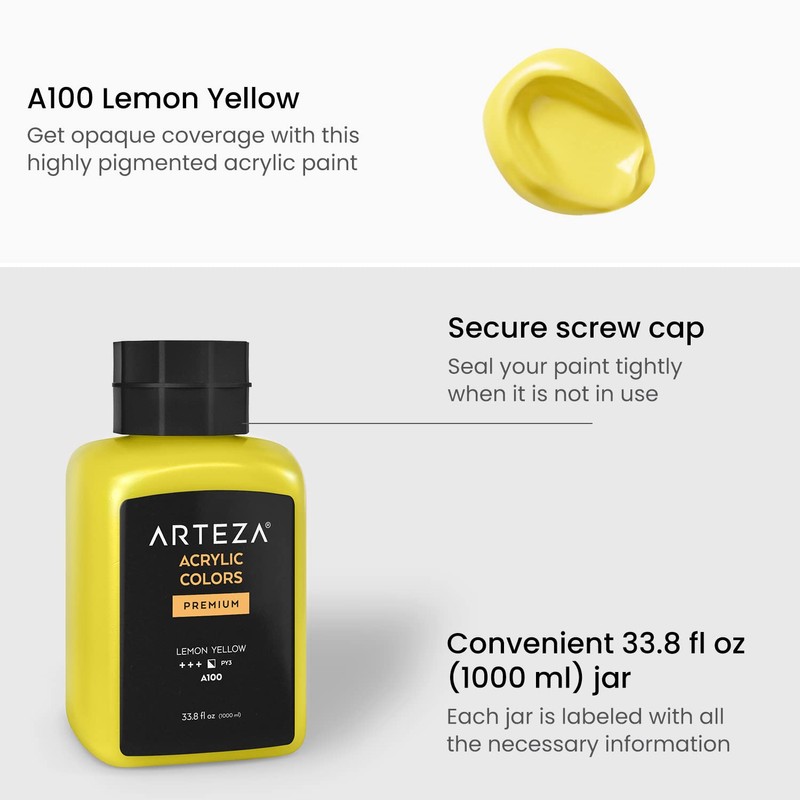 ARTEZA Acrylic Paint, A100 Lemon Yellow, 33.8 fl oz, 1000ml Jar, Opaque, Quick-Drying, Acrylic Paints for Painting on Canvas, Paper, Wood