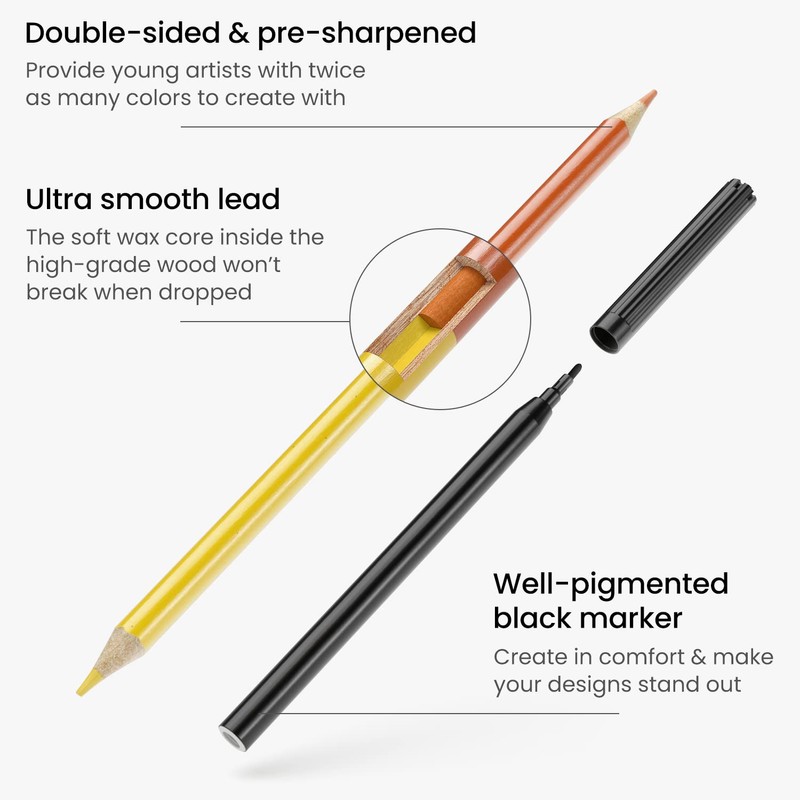 - Set Includes 12 Double-Ended Colored Pencils in 24 Colors: Our coloring book set also included colored pencils for kids, one pencil sharpener, one eraser, and one black marker.
