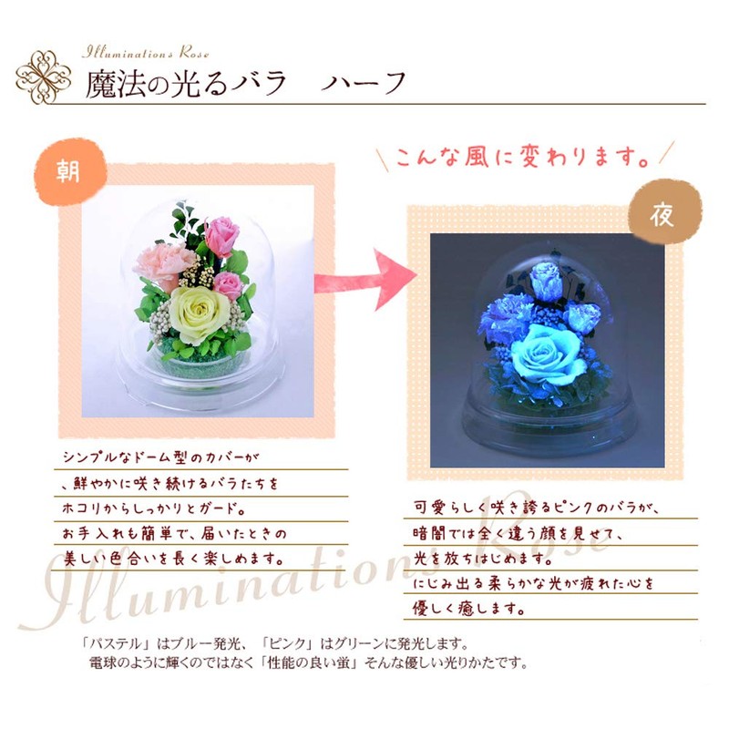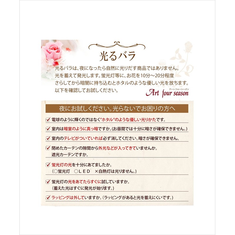 - (Glow Roses) At night, when you bring light such as fluorescent lights or LED lights in the dark, the rose will glow like a fireflie. Flowers have been applied with components that emit light.