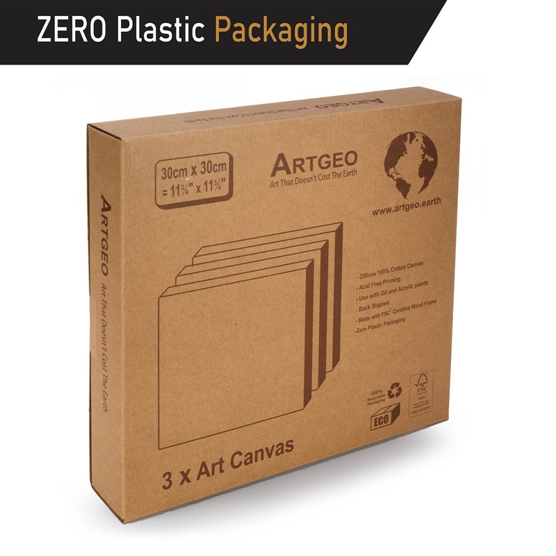 ArtGeo 30cm x 30cm (11 ¾" x 11 ¾") FSC, Stretched Art Canvas, Pack of 3 100% Plastic Free Packaging