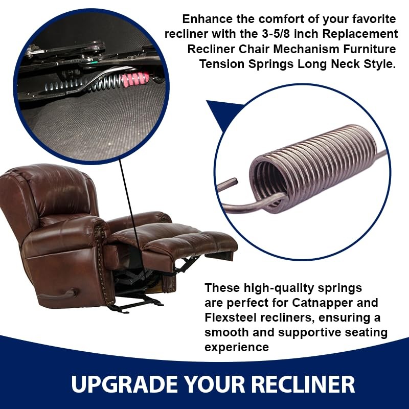 - UPGRADE YOUR RECLINER: Enhance the comfort of your favorite recliner with the 3-5/8 inch Replacement Recliner Chair Mechanism Furniture Tension Springs Long Neck Style. These high-quality springs are perfect for Catnapper and Flexsteel recliners, ensuring a smooth and supportive seating experience