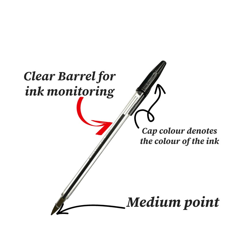 MEDIUM POINT BALLPEN 1mm ball , 0.7mm line width Box A good quality medium point Ballpen with round barrel. Transparent barrel and coloured cap that denotes ink colour. These ball pens are designed for everyday writing and, suitable for offices, schools and home writing. Long lasting oil-based ink means they can be used for archival material without fading. All complete with ventilated caps for additional safety and cap colour denotes the colour of the ink. These multipurpose pens are ideal for taking notes, signing checks, or writing thank you notes to friends and family. They'll make writing more enjoyable. While displaying a contemporary and fashionable appearance, the smoothly gliding ballpoint tip, vibrant free-flowing ink, and comfortable grip guarantee a delightful writing experience. The classic Clear barrel pen is the best-selling ballpoint pen and this box of 50 contains all Green Biro pens.