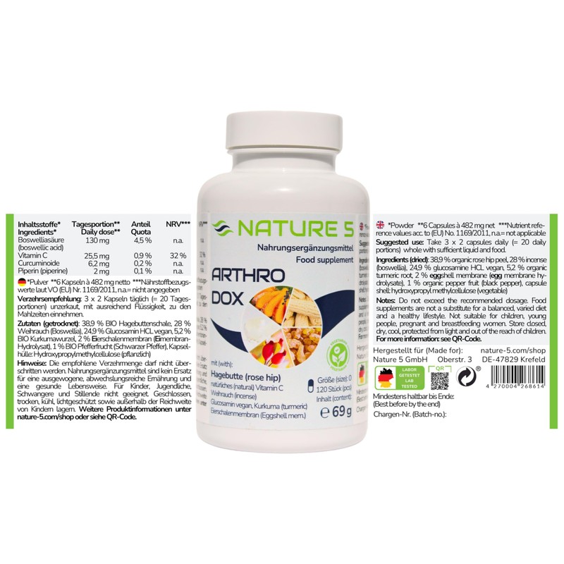 ARTHRODOX® Nature 5® – 120 Capsules – Organic Rosehip with Natural Vitamin C, Frankincense (Boswellia), Glucosamine Vegan, Eggshell Membrane, Turmeric & Piperine, Made & Tested in Germany