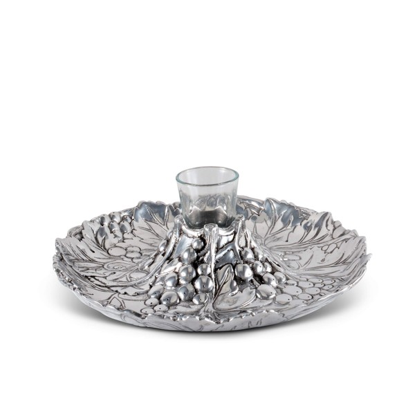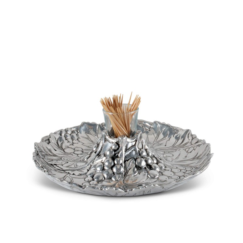 Arthur Court Aluminum Metal Grape Pattern Tidbit Cheese Hors d'oeuvres Tray with Glass for Toothpick - Entertaining Small Platter 10 inch Diameter x 2.25 inch Tall
