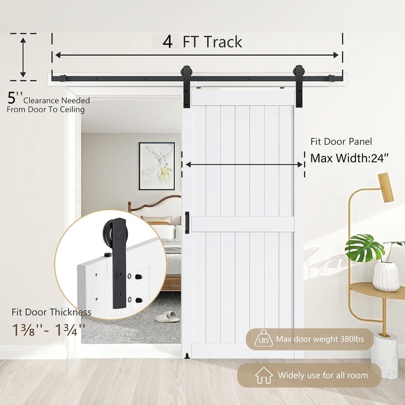 - 【Door weight capacity】: Condition: 100% New; Material: High Quality Carbon Steel; Surface: Frosted Black, Water Proof, Rust Proof; Door Weight Capacity: 230 lbs; Fit door panel width: 24"; Perfect for door panel thickness: 1 3/8" to 1 3/4"