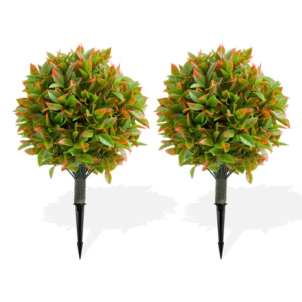 Artificial Boxwood Topiary Ball Trees Set of 2 with Ground Spike, 23.6 inch Height UV Resistant Fake Evergreen Shrubs Bushes Plants, Autumn Faux Greenery Plants for Outdoor Front Porch Garden
