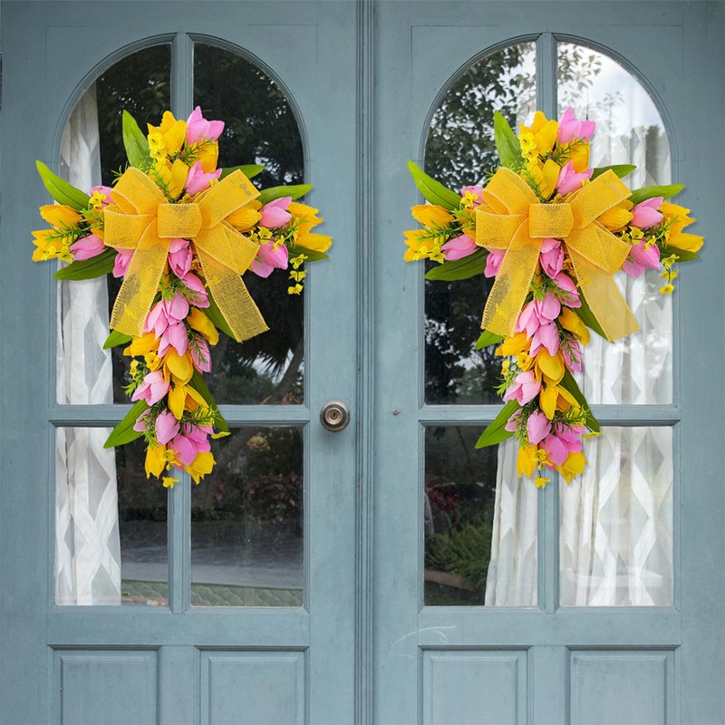 • Novel Easter Wall Wreath: The artificial tulip wreath is designed in the shape of a cross and adorned with ribbons. The combination provides a richer visual experience, radiating holiness and grace, which makes people remember this unforgettable moment