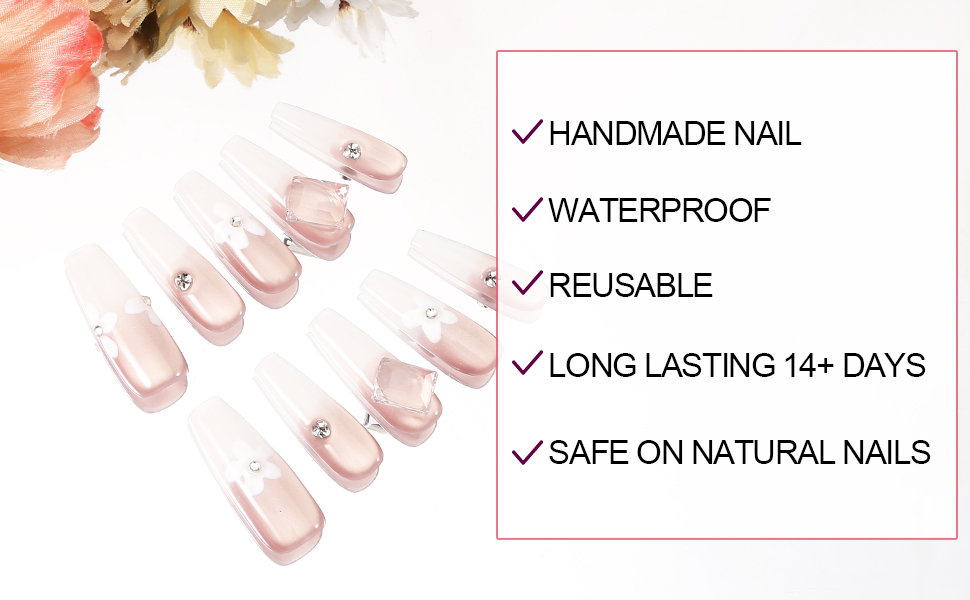 - Special Design: The glue on nails for women is designed with pink natural gradient, and there are hand-painted flowers and diamantes of different sizes on the nails, which make the nails look brighter and show a unique and popular style, perfect for daily dating, prom, party or other festivals, adding charm and personalized color to you. It is also a beautiful gift for ladies and girls.