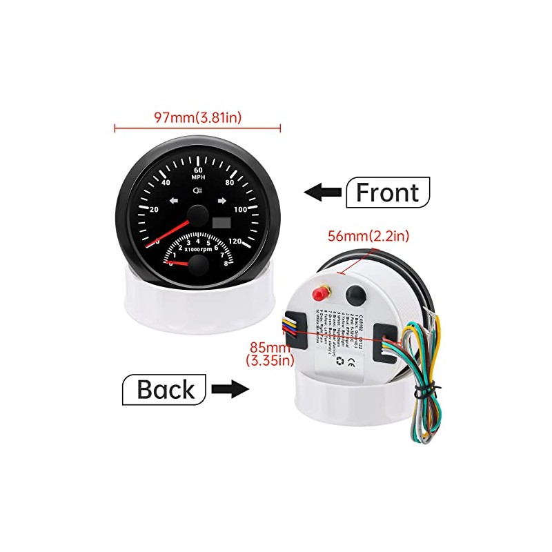 - Material: el velocímetro GPS para barco de 3.346 in (3-3/8 pulgadas) está hecho de bisel de acero inoxidable 316L, goma, vidrio antivaho y resistente al agua IP67. Orificio estándar de 3.346 in (3-3/8 pulgadas) en el panel y permite un espacio libre de 2.165 in (2-3/16 pulgadas) detrás del panel para adaptarse al calibrador