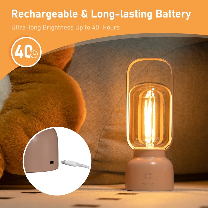Artin-X Retro Cordless Lantern Table Lamp, 40 Hours Long Lasting Dimming Night Light, Small Rechargeable Battery Operated Light for Nightstand, Decoration, Gift- Pink