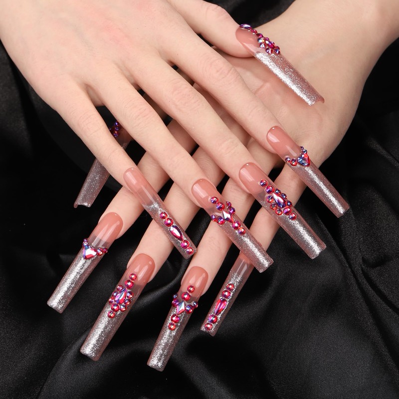 Artiprint Nude Glitter Coffin Press-On Nails with Rhinestone Accents, Long Length, Sparkling & Stylish for Parties and Special Events(L169, M)