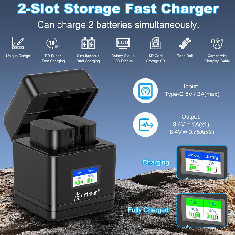 - Dual-Slot USB Charger with LCD Display: Charge 2 LP-E6P batteries simultaneously with real-time LCD status. It also could as a storage case to store two packs batteries to protect batteries from impact/dust, includes SD card holders for added convenience