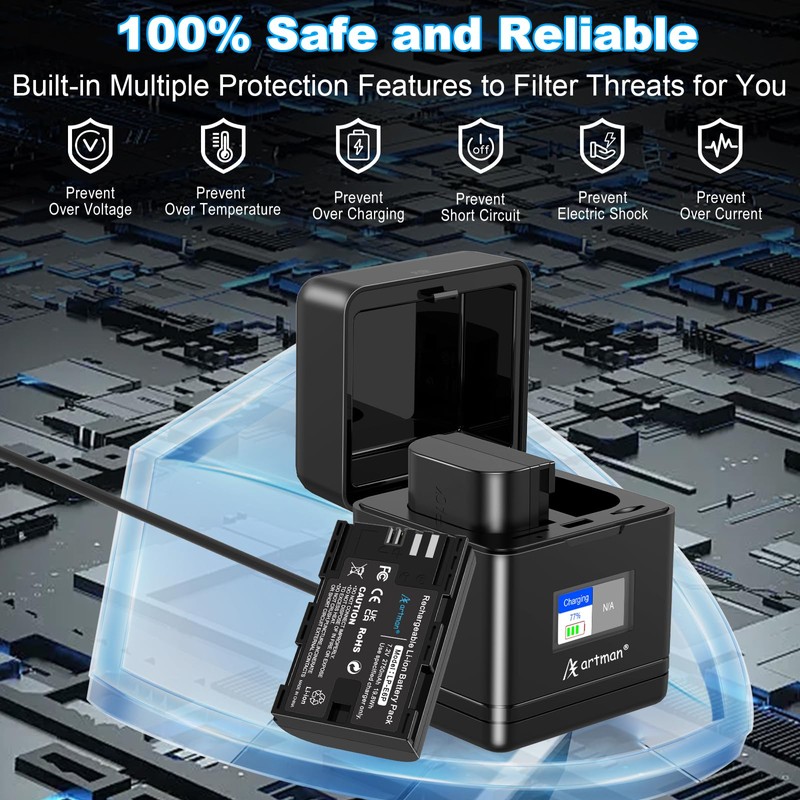 - Reassuring Quality & Safety:Built with fireproof ABS+PC casing & premium chips, this LP-E6P set protects against overheating, overcharging, over-discharge, short circuits, overcurrent, and overvoltage for safe charging and use