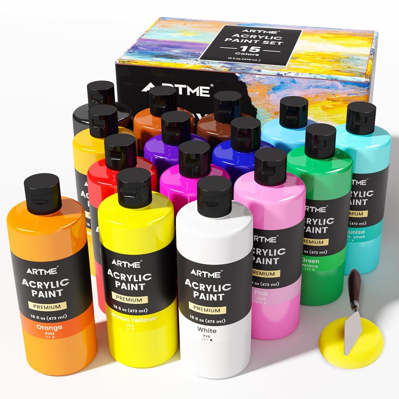 artme Acrylic Paint Set, 15 Unique Colors (16oz/473ml) Large Bulk Acrylic Paint Non Toxic, Waterproof, Rich Pigments Perfect for Artists, Students Painting on Canvas Stone Wood Fabric Ceramic Crafts