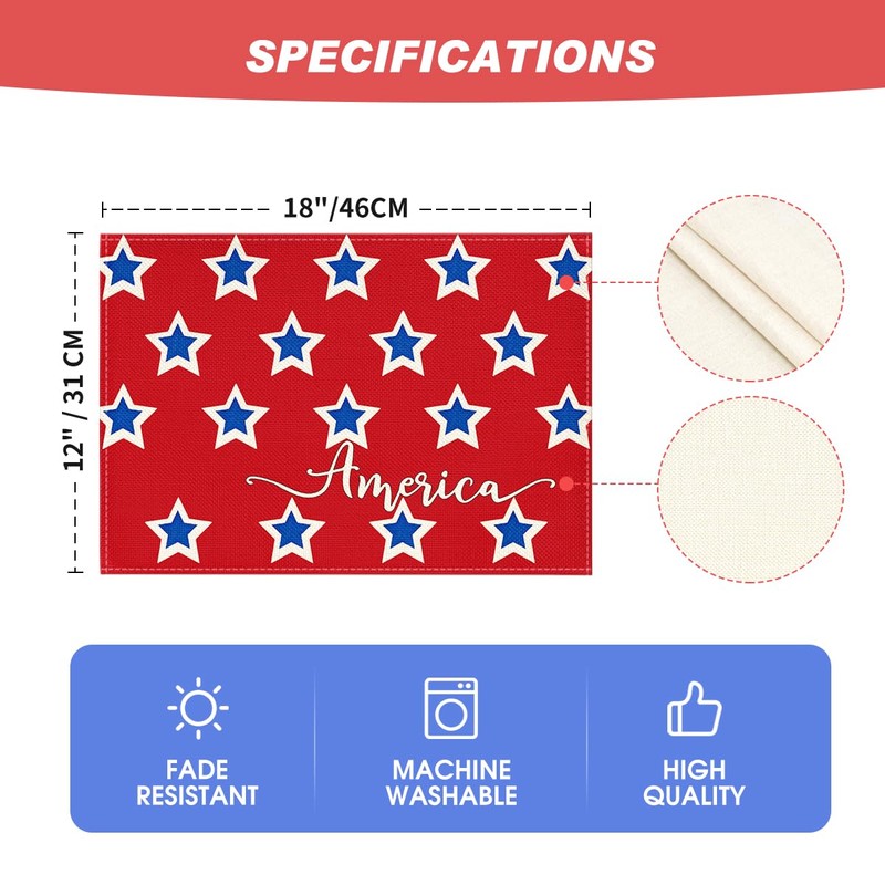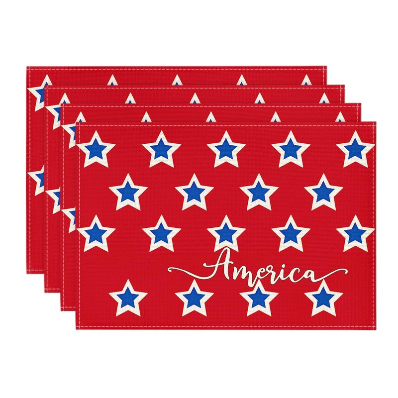 Artoid Mode America Stars Block Patriotic 4th of July Placemats Set of 4, 12x18 Inch Memorial Day Holiday Table Mats for Party Kitchen Dining Decoration