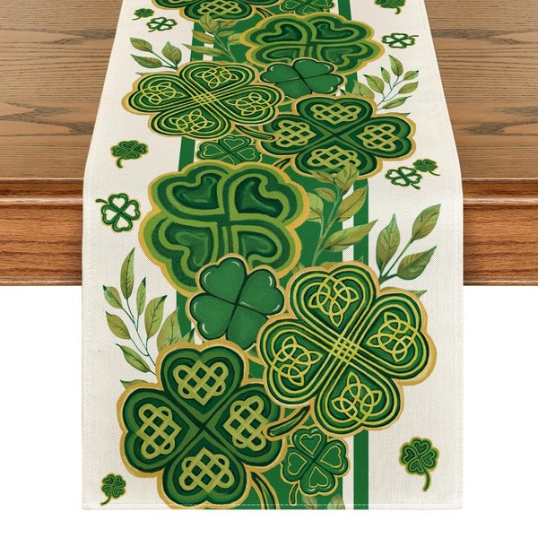 Artoid Mode Leaves Clover Shamrocks Stripes St. Patrick's Day Table Runner, Holiday Kitchen Dining Table Decoration for Home Party Decor 13x72 Inch