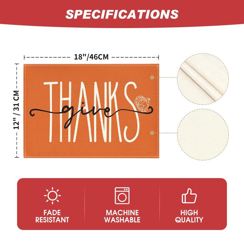 - Easy to Clean: Machine wash and lay the placemat flat to dry. Stays the same and as new after every wash. Material: 100% Polyester, no shrink, no color ran. Imported, Country of origin: China