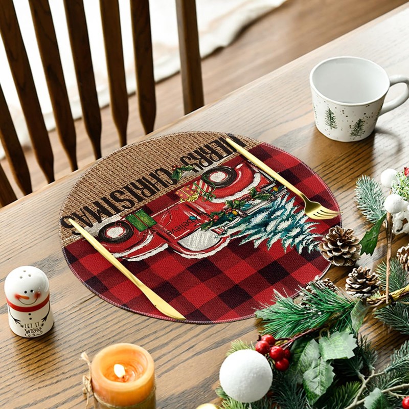 Artoid Mode Red Buffalo Plaid Xmas Trees Car Merry Christmas Round Placemats Set of 4, 14 Inch Winter Round Table Mats for Dining Decoration