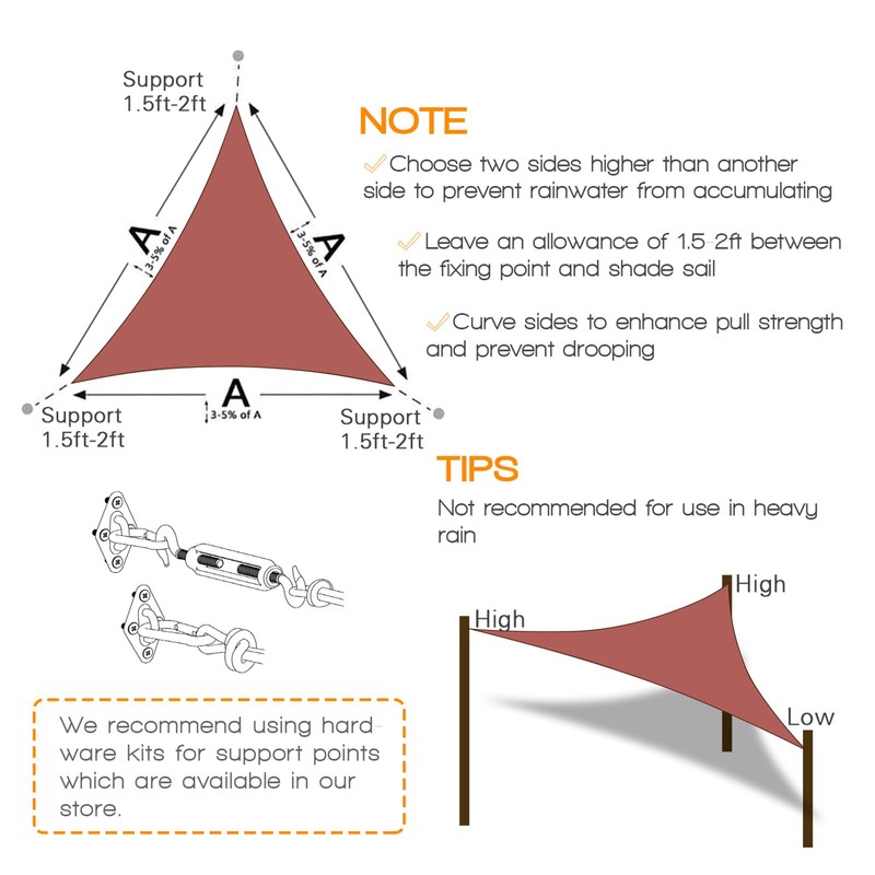 - 【Installation & Measurement】Apart from the sail dimensions, sail corners to fixed points should be 1-2 feet to allow for attachment. Since our sails are woven, they may experience a 3%-5% stretch. Therefore, when you receive a brand new, uninstalled item, the flat measurement size will be slightly smaller than you ordered. As you assemble and tension the sail, you'll notice the size increasing due to fabric stretch. The final measurement should be reached approximately 2 weeks later.