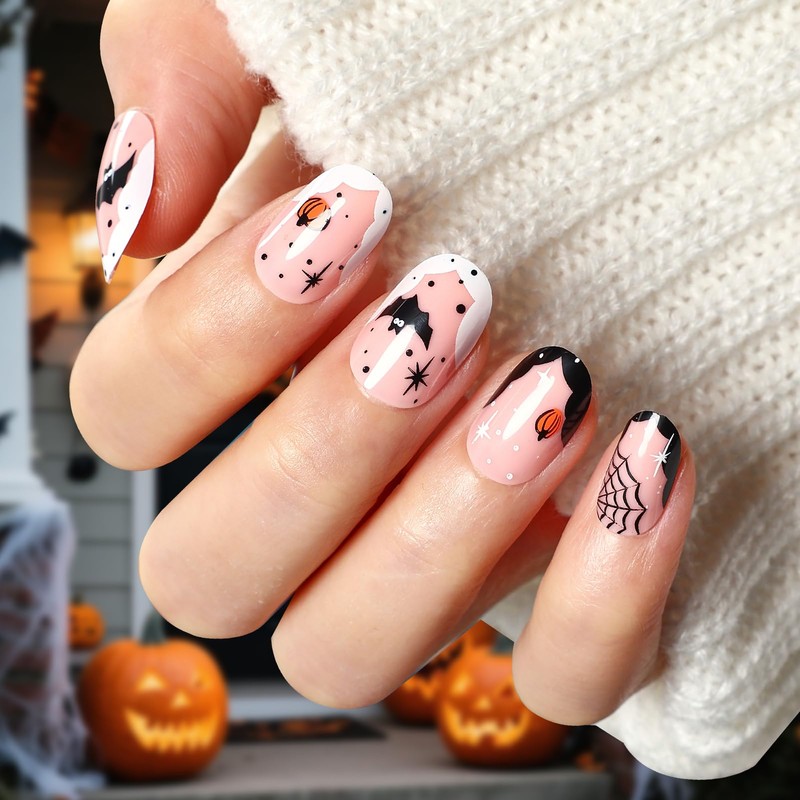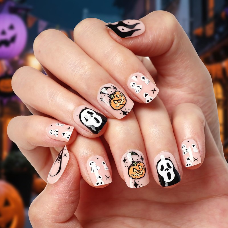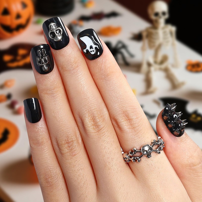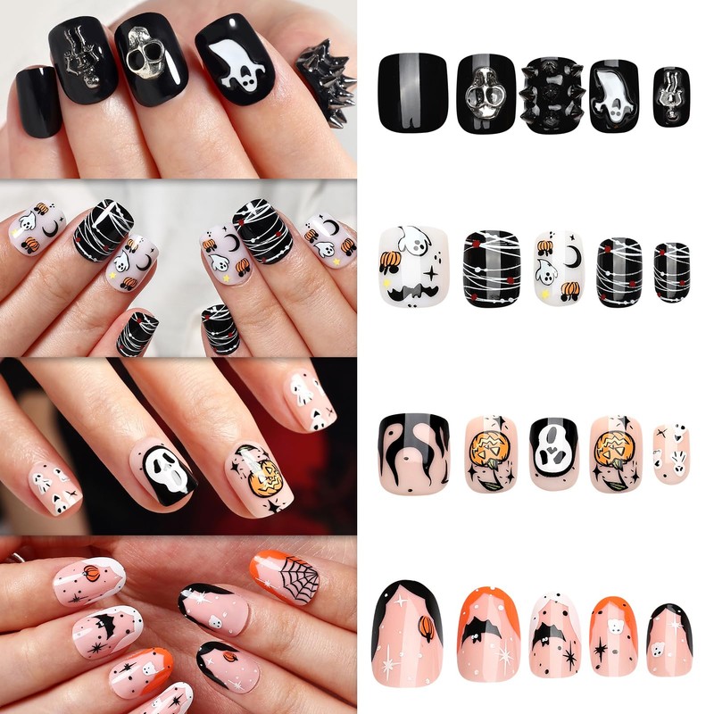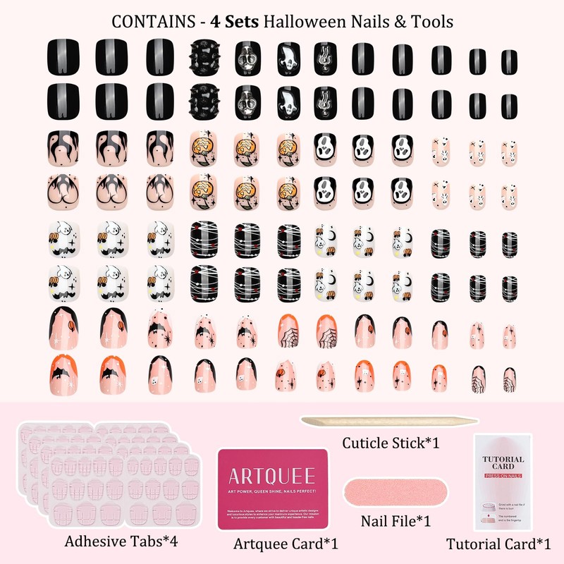 - Discover Artquee Halloween Press-On Nails: Each cool spooky design is uniquely developed by us, offering standout nails for your witch, monster, or haunting Halloween costume, featuring pumpkin, flame, spider web, bat, ghost patterns, and 3D skull, studs, skeleton accents