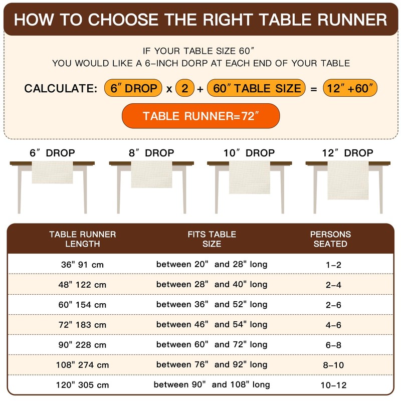 - 【Size Guide】- This 13"x90" fall table runner fits tables that seat 6-8 people. Explore our sizing guide visuals to find the perfect fit for your dining table