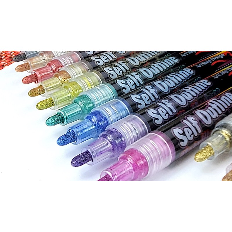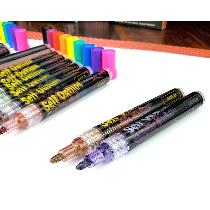 - SELF-OUTLINING, DOUBLE LINE PENS: These Shimmer Markers simultaneously apply two layers of paint. The base layer is a thick, shimmering silver or gold metallic. A second layer of brightly colored outline paint is applied at the same time. This outline paint is lighter and automatically spreads to the edge of the lines you draw, creating a unique, colorful outline!
