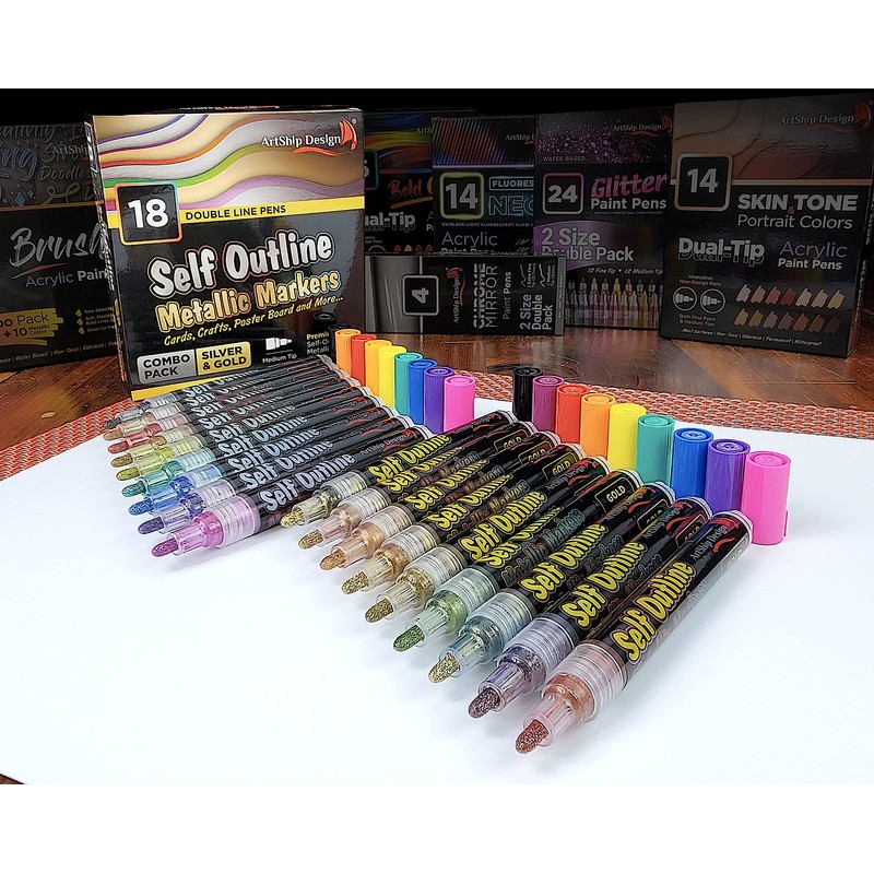 ArtShip Design 18 Gold & Silver Self Outline Metallic Shimmer Paint Pen Combo Pack Extra Large Barrels Permanent Double Line Markers Journal Pens, Scrap Booking, Cards, DIY Crafts, Posters, Cards