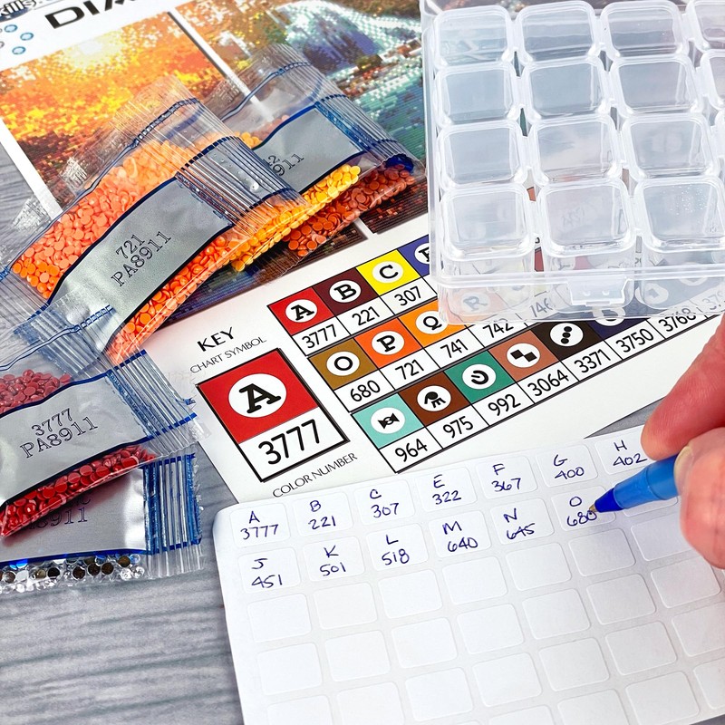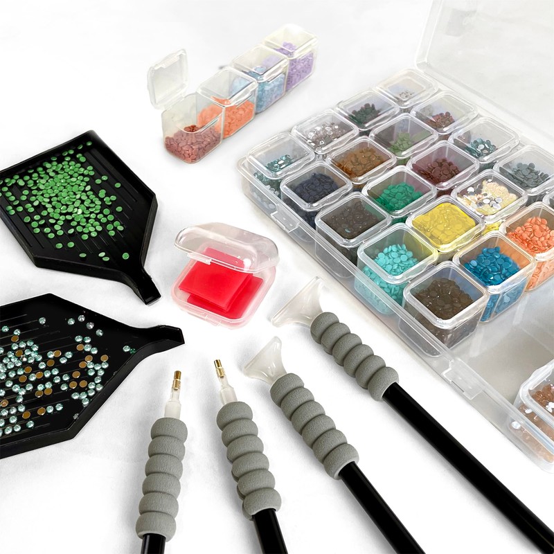 • Diamond Painting Accessories C With two diamond trays, four diamond painting pens, drill storage containers with labels, and two pieces of diamond painting wax, you can have fun creating your dazzling work of art right out of the box.