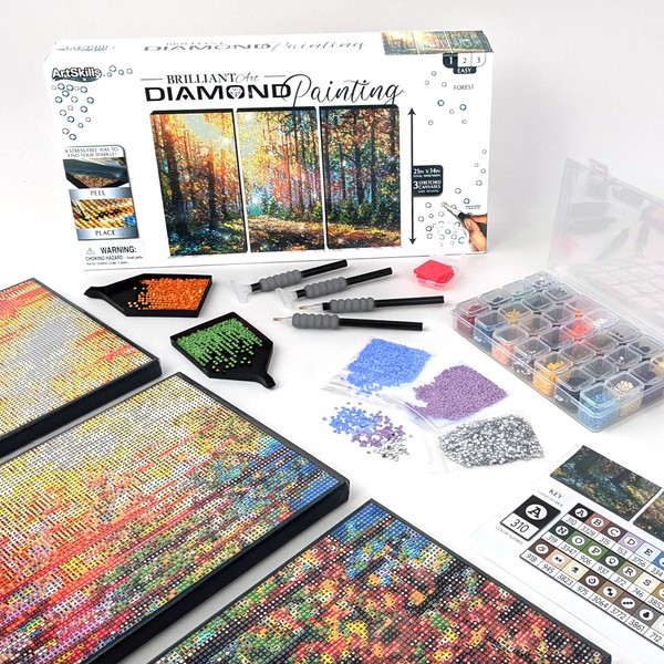 ArtSkills Diamond Painting Kit, Diamond Art on Framed Canvas with Gem Storage Case and Accessory Kit, Forest, 3 Stretched Canvas Panels, 14” x 7” Each