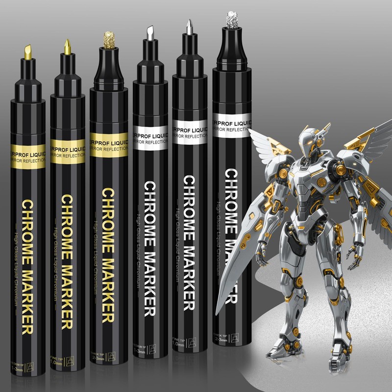 Artugn 6Pcs Oil-based Chrome Mirror Markers - Silver & Gold Permanent Metallic Markers for Model Painting, DIY Projects - Waterproof, Reflective Gloss Pens