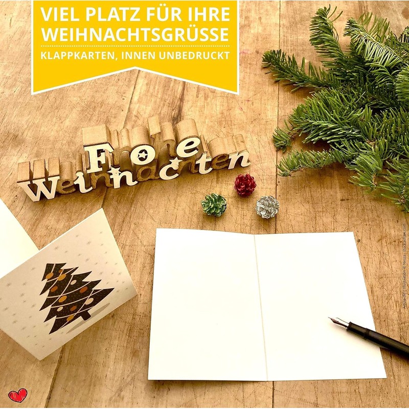 - Klappkarten sind bedruckt mit den liebenvollen weihnachtlichen Illustrationen von einem Fuchs, dem Schneemann, einem Bär, einer Katze im Weihnachtspaket und einem Weihnachtsbaum in fröhlicher feiner goldener Anmutung. Ebenfalls im Set enthalten sind die passenden und selbstklebenden Briefumschläge