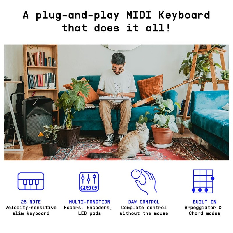 - ALL SWITCHES IN ONE CONTROLLER: Powered by USB. It has a flat keyboard with 25 notes, 2 benches of 8 high-quality pads with RGB backlight, 8 rotation and 4 sliders, a mini display and a clickable browsing dial, an integrated arpeggiator, hold and chord modes, 2 touch sensors for pitchbend and modulation wheel, a USB-C port and a MIDI output. Great for beginners, but also suitable for professionals to optimise your mix.