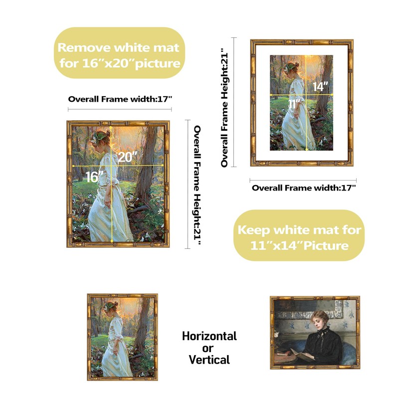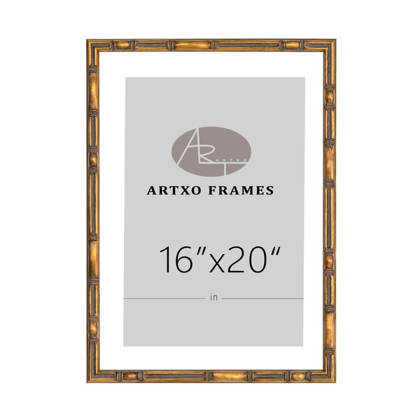 ArtXO 16"x20" Picture Frame Wooden, Display Pictures 11"x14" with Mat or 16"x20" Without Mat, Gold Bamboo Poster Frames,Hanging Photo Frame Wall