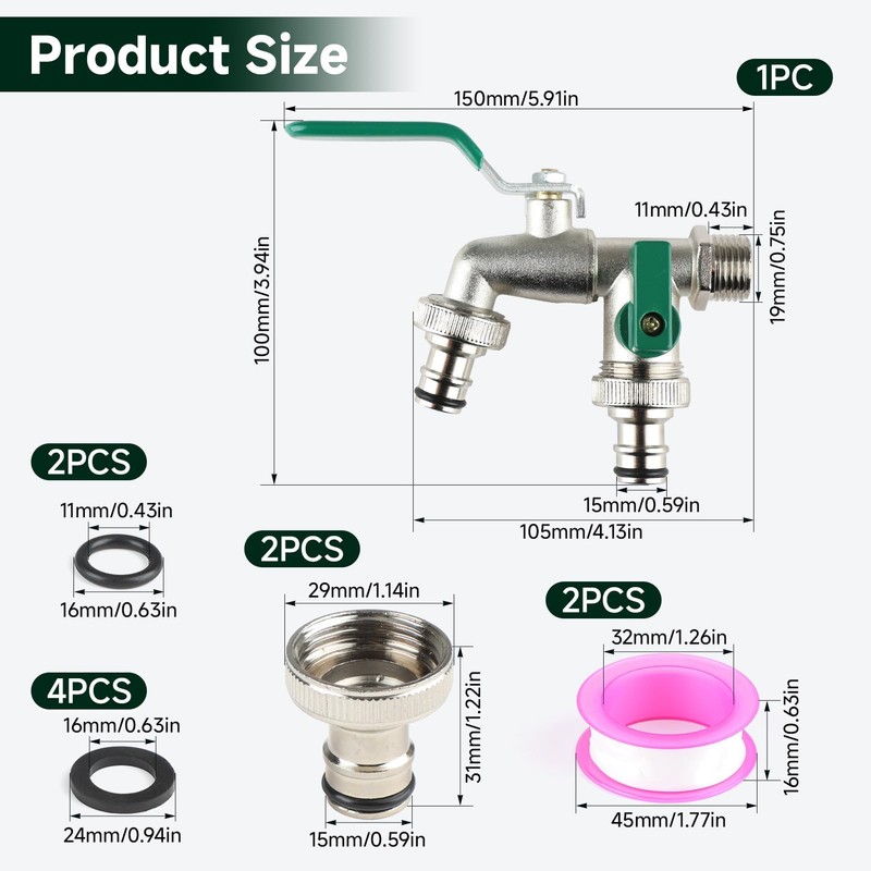 - 【Vollständiges Zubehör, Einfach zu Installieren】Wasserhahn für regentonne enthält einen 2*schlauchanschlüsse, 2*dichtungen, 2*7m rollendichtband und 2*unterlegscheiben. Sodass Sie sofort loslegen können, ohne zusätzliches Zubehör kaufen zu müssen