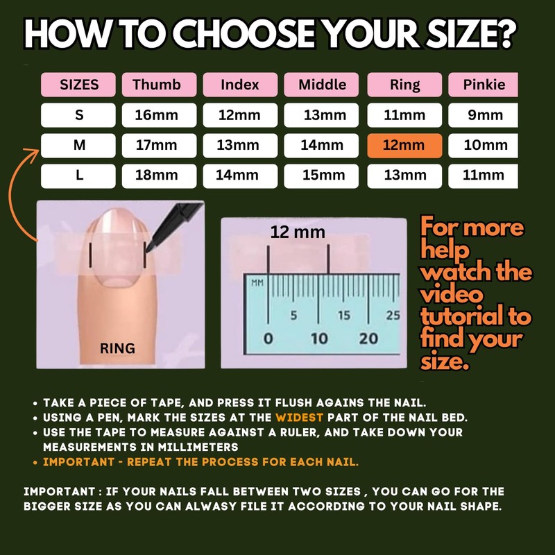 - How to Choose Your Press On Nails Size: Everyone’s nails are unique, but our sizes are designed to fit surprisingly well. We offer three sizes: Small, Medium, and Large. To find the best fit, simply measure the width of each of your nails and refer to our size chart. For additional help, check out our videos for tips on selecting the perfect size. Pro Tip: If you're between sizes, we recommend choosing the larger size—you can easily file the edges to customize the fit and match your natural nail shape perfectly.