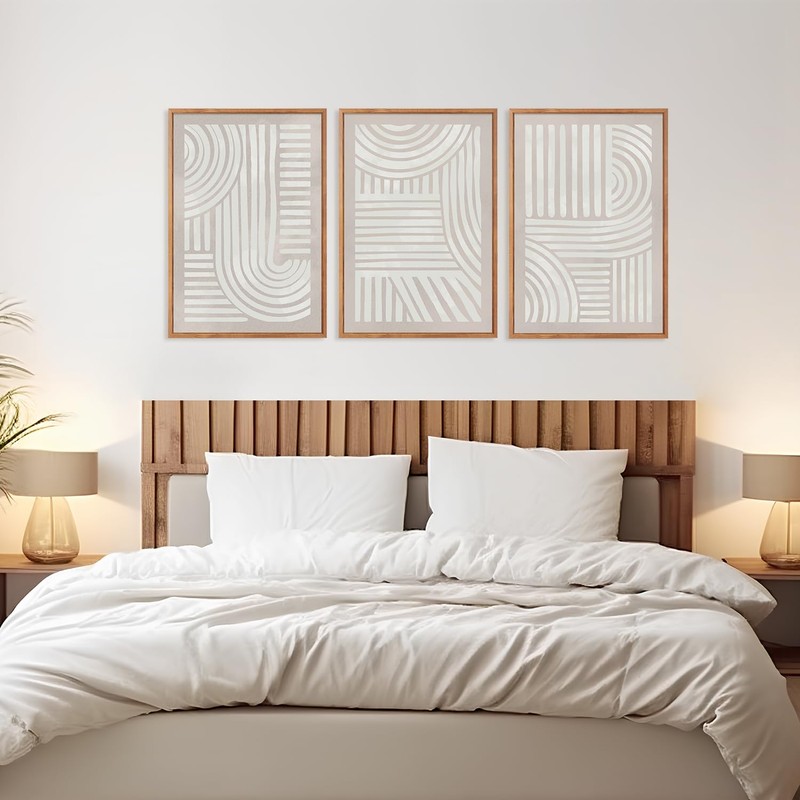 - 【You'll Get】Set of three large 16x24 inches in a cardboard box with accessory kit. Two gear hooks on the back of each Abstract Geometric Line Wall Decor and comes with eight non-marking nails for nailing to the wall.