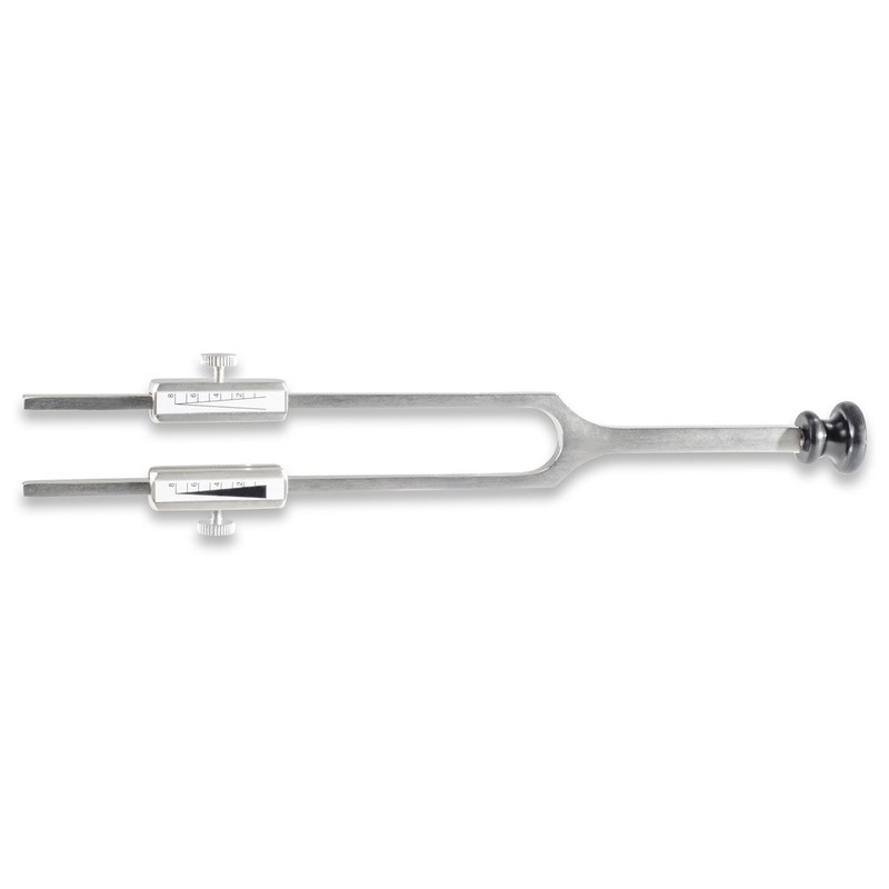 The tuning fork has a length of 23 cm and a weight of 132 grams, the dampers are removable and the item is new. The material thickness is 8 mm and is produced according to ISO-9002/EN46002. The Rydel-Seiffer tuning fork (named after A. Rydel and Friedrich Wilhelm Seiffer) is a medical instrument that allows you to examine impairments of the peripheral nervous system or also orientate the hearing ability. The Rydel-Seiffer tuning fork has two scaled weights on the jaws of the tuning fork, allowing for quantification of possible nerve failures. To check the vibration sensation, place the struck and swinging tuning fork on the inter-toe joint of the big toe. The patient indicates the time when he no longer feels the vibrations. The examiner reads this time on the scale.