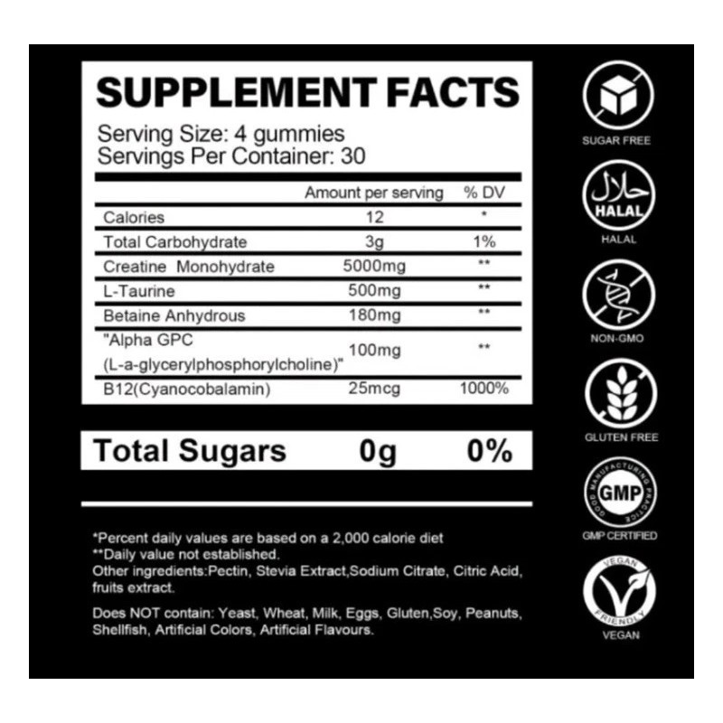 - Ingredients: Creatine Monohydrate, Taurine, Vitamin B12