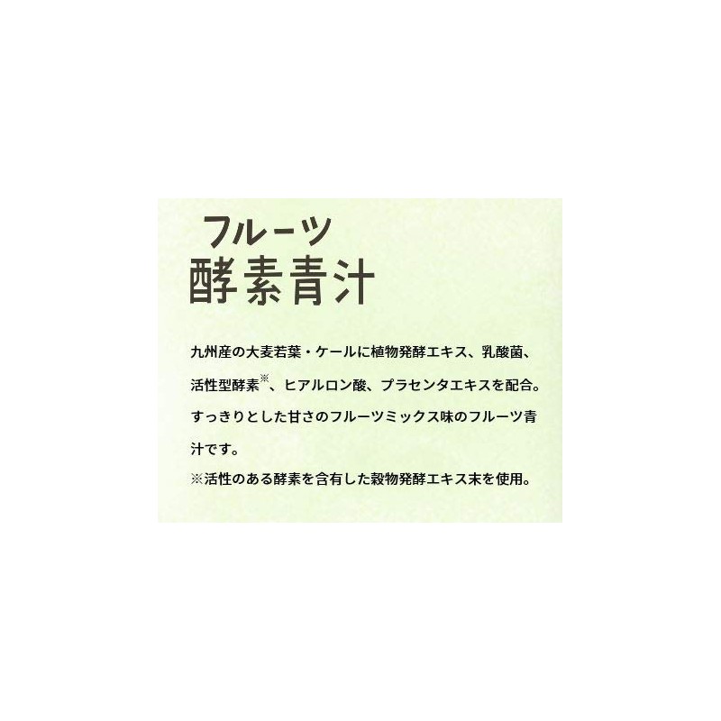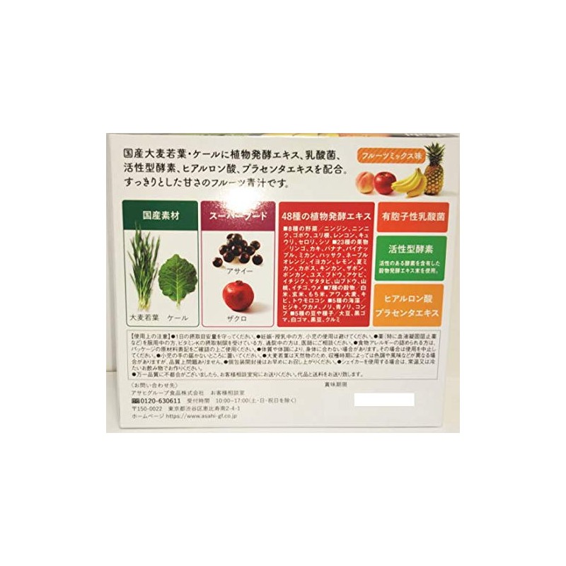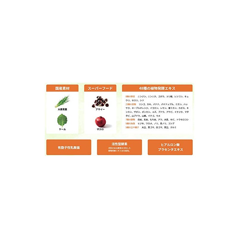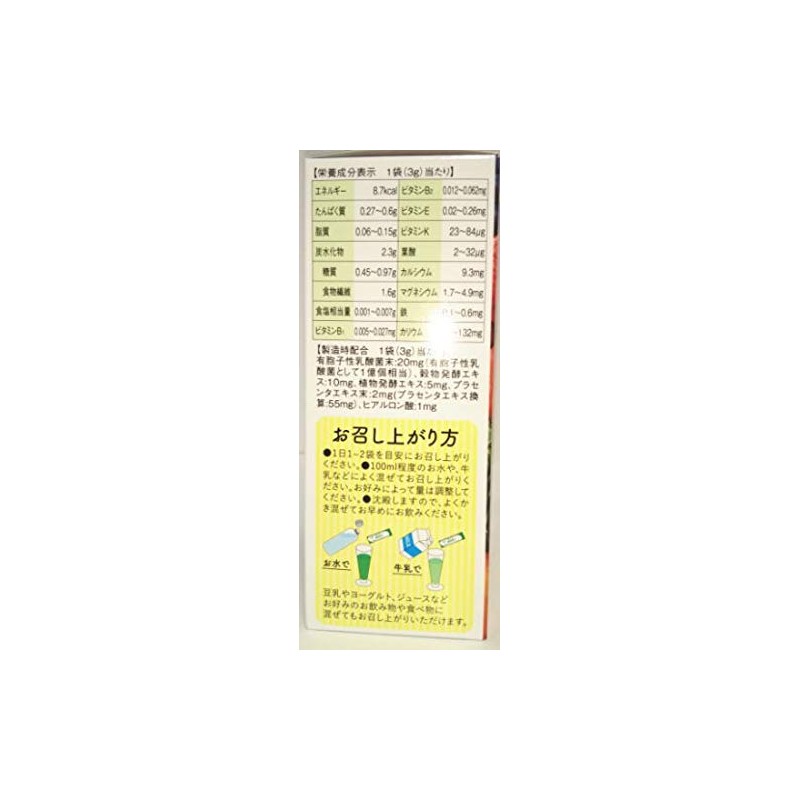 - Barley Wakashi Powder (from Kyushu), Water Soluble Dietary Fiber, Kale Powder (from Kyushu), Yeast Extract, Apple Juice Powder, Peach Juice Powder, Pineapple Juice Powder, Banana Powder, Spore-based Lactic Acid Bacteria, Grain Fermentation Extract (including wheat), Pomegranate Juice Powder, Acai Powder, Vegetable Powder, Vegetable Powder, Yeast Extract ( Contains orange, walnut, sesame, and soybeans), pig-brascenta extract / acidulant, flavoring, sweetener (stevia), hyaluronic acid