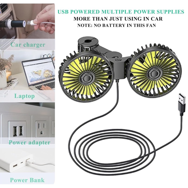ASANDH Car Fan, Dual Head USB Car Fans for backseat for kids, 3-Speed Air Speed and 360° Rotating Rear Seat Cooling Carseat Fan 5V Powerful Air Circulation Fan for Sedan SUV RV Truck
