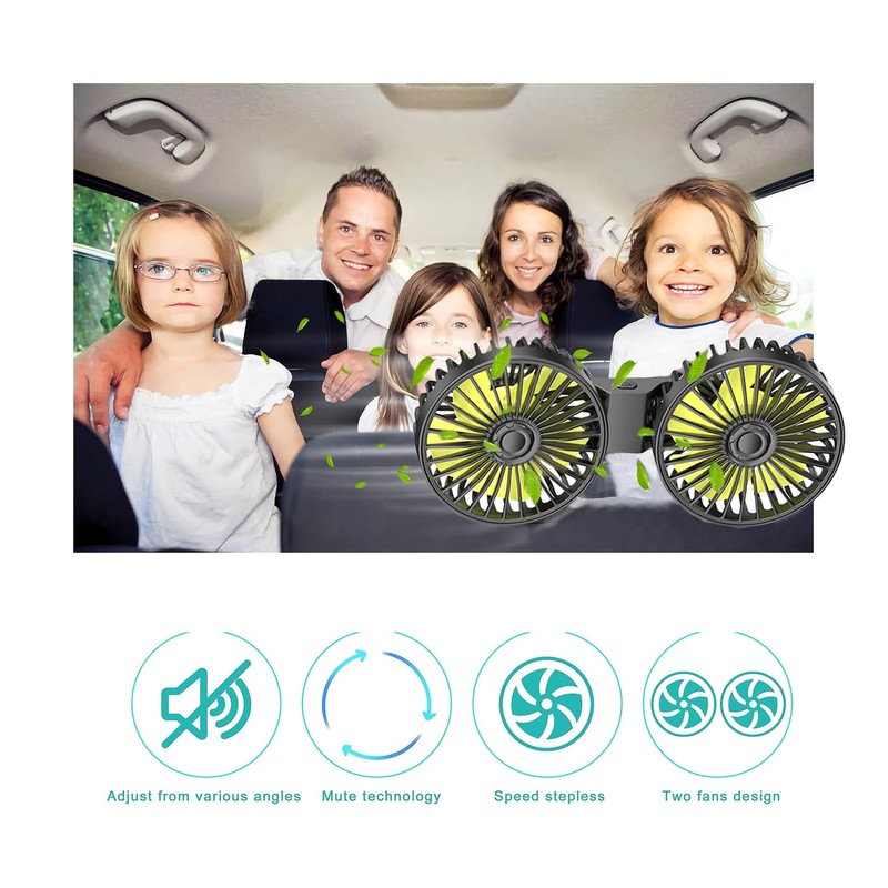 - [NEW USB CAR FAN]: car fan can rotate 360 degrees, 12V/ 24V car fan with 2 rotatable fan heads can quickly help cool down the temperature, also can reduce the humidity of the windshield in the car on rainy days, quickly remove the excess smoke, dust or pet odour, make the backseat air circulate and keep fresh, make the backseat passengers or pets feel cool and comfortable in the car.