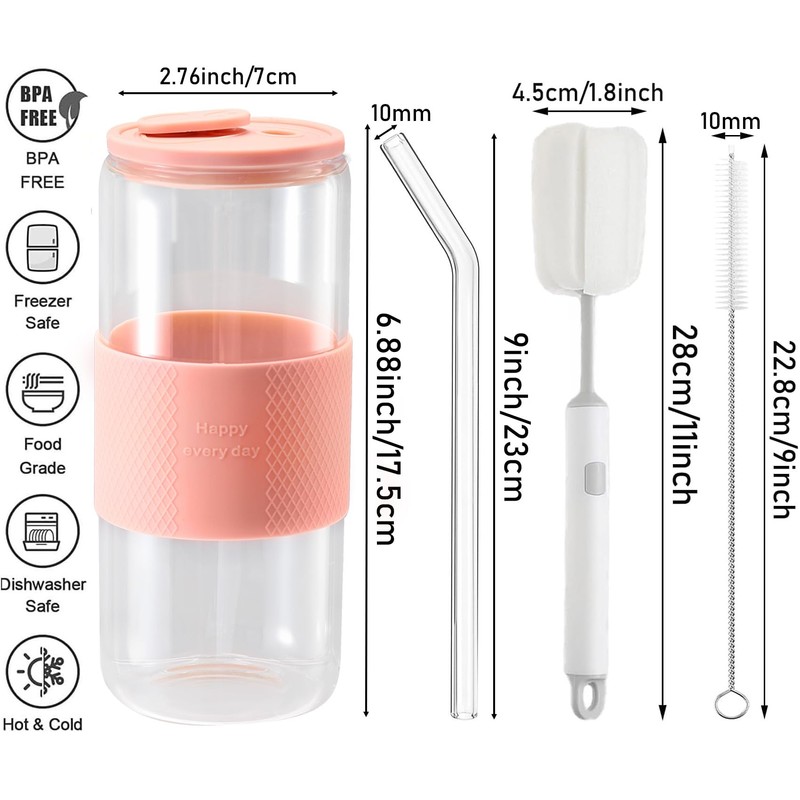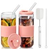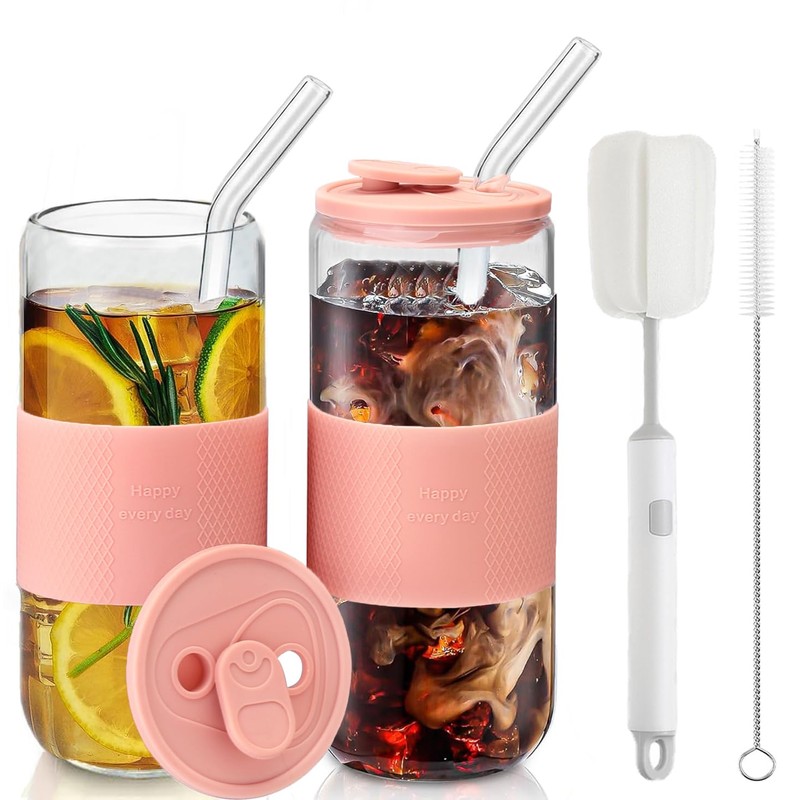 ASANMEYO 20oz Can Shaped Glass Cups with Silicone Lids and Glass Straw, 2PCS Drinking Glasses with Lids and Straws, and Silicone Sleeves, Beer Glasses, Iced Coffee Cups, Soda, Gift - Pink