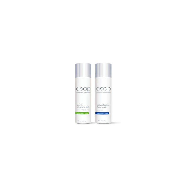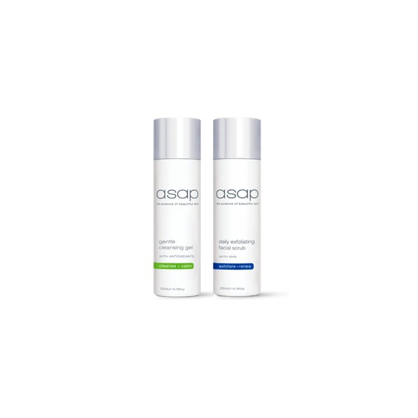 The asap Gentle Cleansing Gel and Exfoliating Facial Scrub 200ml Bundle contains the asap Gentle Cleansing Gel and the asap Daily Exfoliating Facial Scrub, both formulated to cleanse and improve the appearance and texture of the skin.