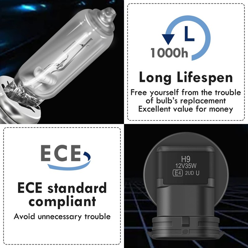 - Excellent Brightness: H9 halogen headlight bulb has 65W power. High-performance halogen headlight bulbs produce bright yellow light with a longer wavelength; allowing you to see obstacles on the road clearly, ensuring you get better visibility and faster reaction times.