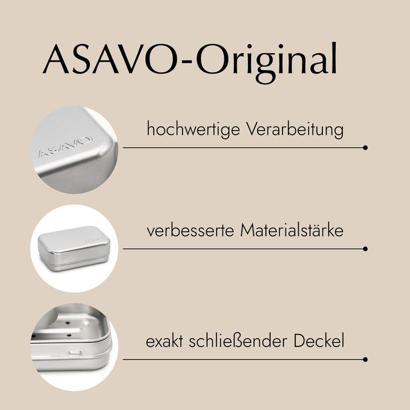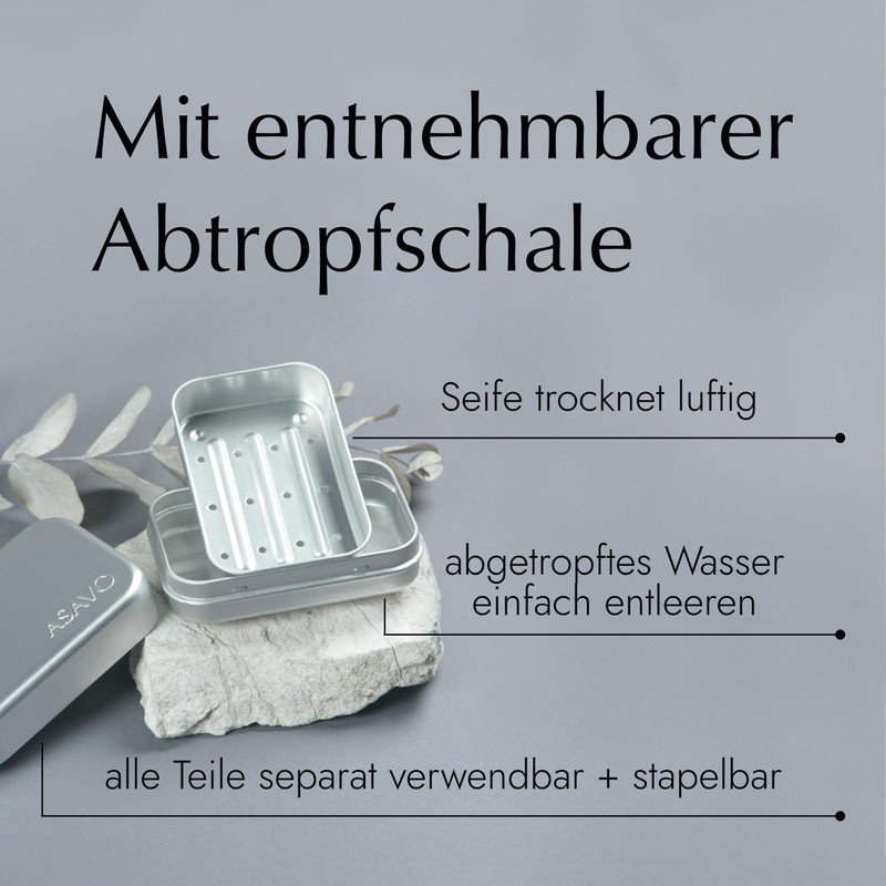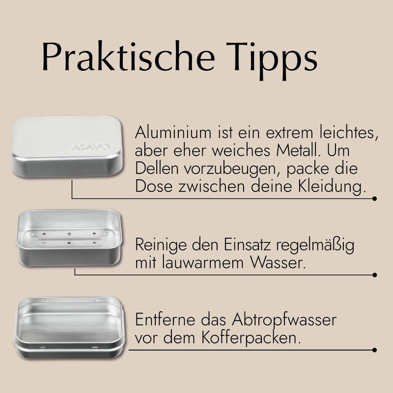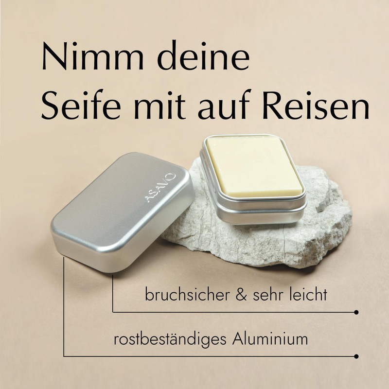 The soap box made of food-safe coated aluminium is the perfect travel companion for your soap. A piece of ASAVO soap fits comfortably in the can. Your soap can be transported easily and cleanly.