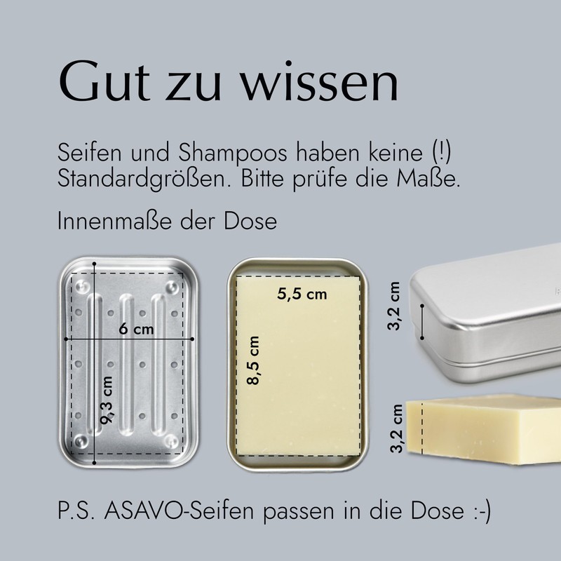 • Please note: there are no standard dimensions for soaps. Please check if your soap fits in the tin using the drawing. Our ASAVO soap fits in the tin.